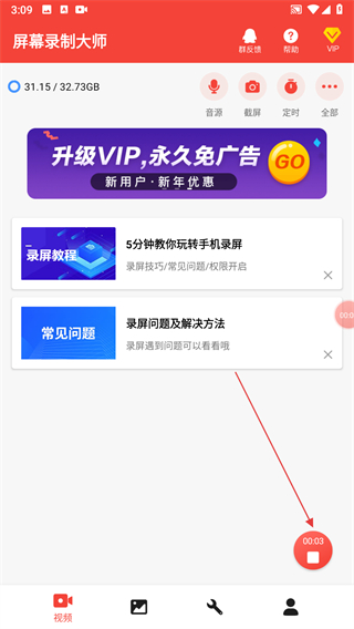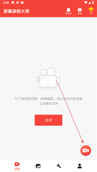 啟動軟件,并允許軟件所請求的權(quán)限(錄屏,存儲,錄音);
