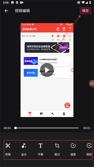 4、進(jìn)入視頻編輯頁面后,使用功能對視頻進(jìn)行編輯后點擊保存。