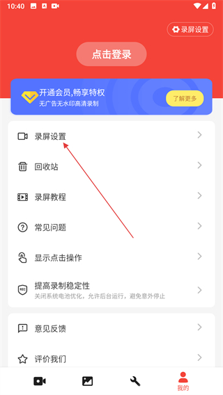2、在我的頁面,點擊錄屏設(shè)置選項。