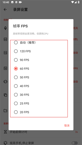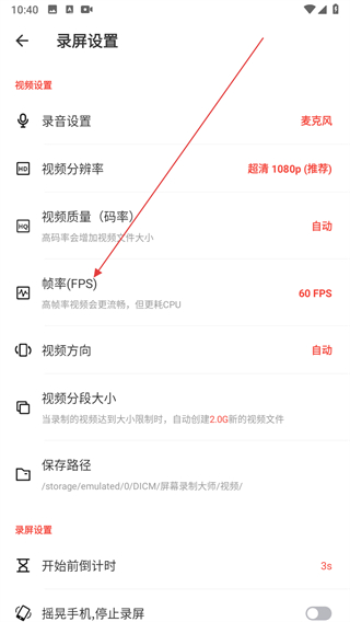 3、在錄屏設(shè)置頁面,點擊幀率選項。