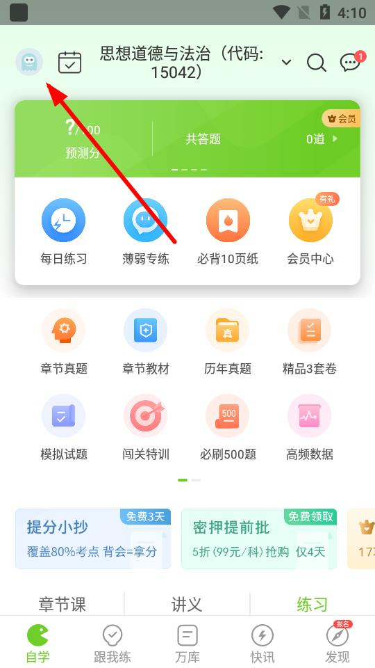 1、打開(kāi)萬(wàn)題庫(kù)應(yīng)用,點(diǎn)擊左上角的頭像圖標(biāo),進(jìn)入個(gè)人相關(guān)界面。