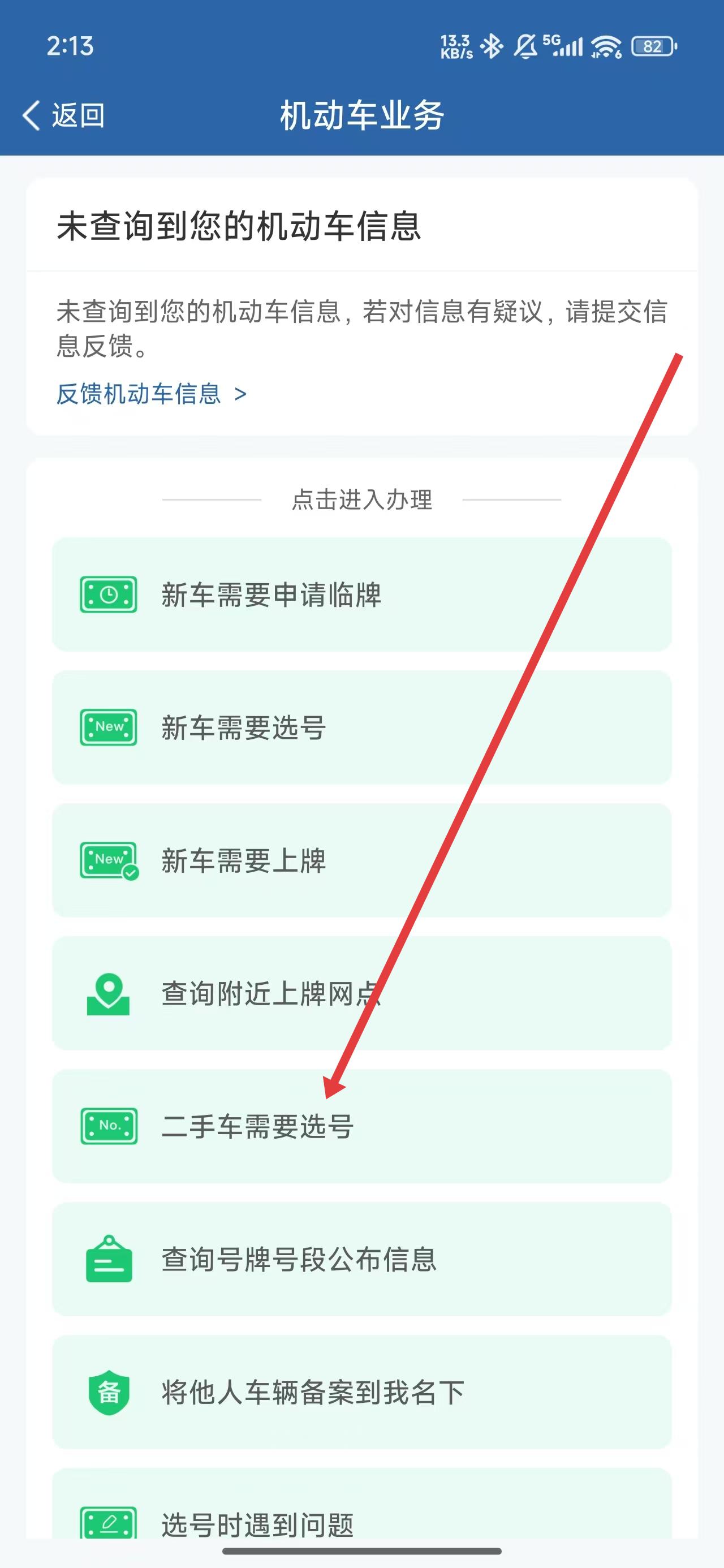 3、在點(diǎn)擊機(jī)動(dòng)車業(yè)務(wù)下的二手車需要選號(hào)業(yè)務(wù),為二手車辦理選號(hào)業(yè)務(wù)。