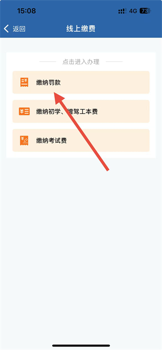 3、在線上繳費(fèi)頁(yè)面點(diǎn)擊繳納罰款選項(xiàng),進(jìn)入罰款繳納頁(yè)面。