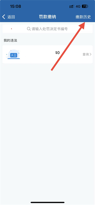 4、在罰款繳納頁(yè)面點(diǎn)擊繳款歷史選項(xiàng),即可查看罰款繳費(fèi)記錄。