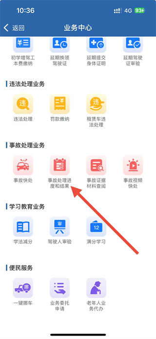 2、在業(yè)務(wù)中心頁(yè)面的事故處理業(yè)務(wù)板塊中,點(diǎn)擊事故處理進(jìn)度和結(jié)果選項(xiàng)。
