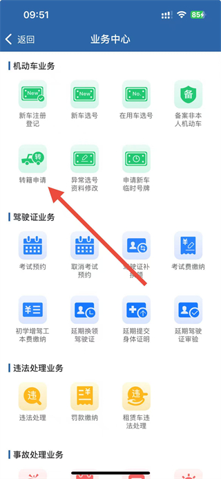2、在業(yè)務(wù)中心的機(jī)動(dòng)車業(yè)務(wù)板塊,點(diǎn)擊轉(zhuǎn)籍申請(qǐng)選項(xiàng)。