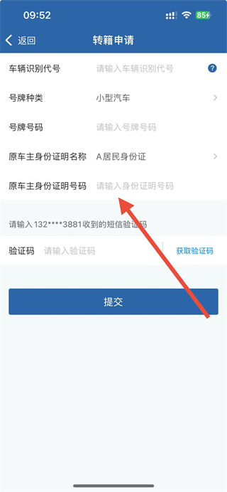 5、然后填寫(xiě)車輛信息,輸入驗(yàn)證碼后點(diǎn)擊提交即可完成轉(zhuǎn)籍申請(qǐng)。