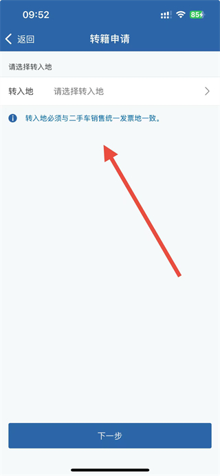 4、在頁(yè)面點(diǎn)擊選擇轉(zhuǎn)入地,在區(qū)域列表選擇地區(qū)。