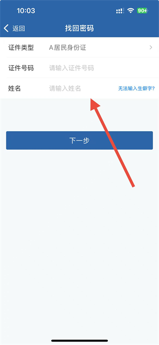 2、在找回密碼頁(yè)面,選擇證件類型為居民身份證,輸入證件號(hào)碼和姓名,點(diǎn)擊下一步。