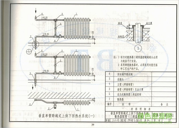 本圖集主要內(nèi)容有散熱器及其安裝;暖風(fēng)機(jī)安裝‘暖氣系統(tǒng)附件安裝;戶用壁掛爐安裝;熱力入口裝置;低溫?zé)崴孛孑椛洳膳环謶粲嬃坎膳?;方形補償器;管道固定支架;管道穿墻穿樓板安裝。