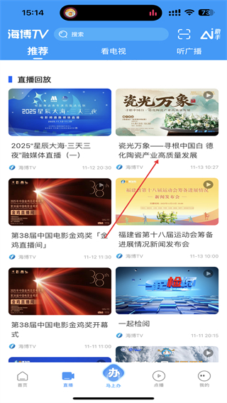 1、打開海博TV的APP,進(jìn)入時(shí)點(diǎn)擊導(dǎo)航欄中直播的圖標(biāo)。
