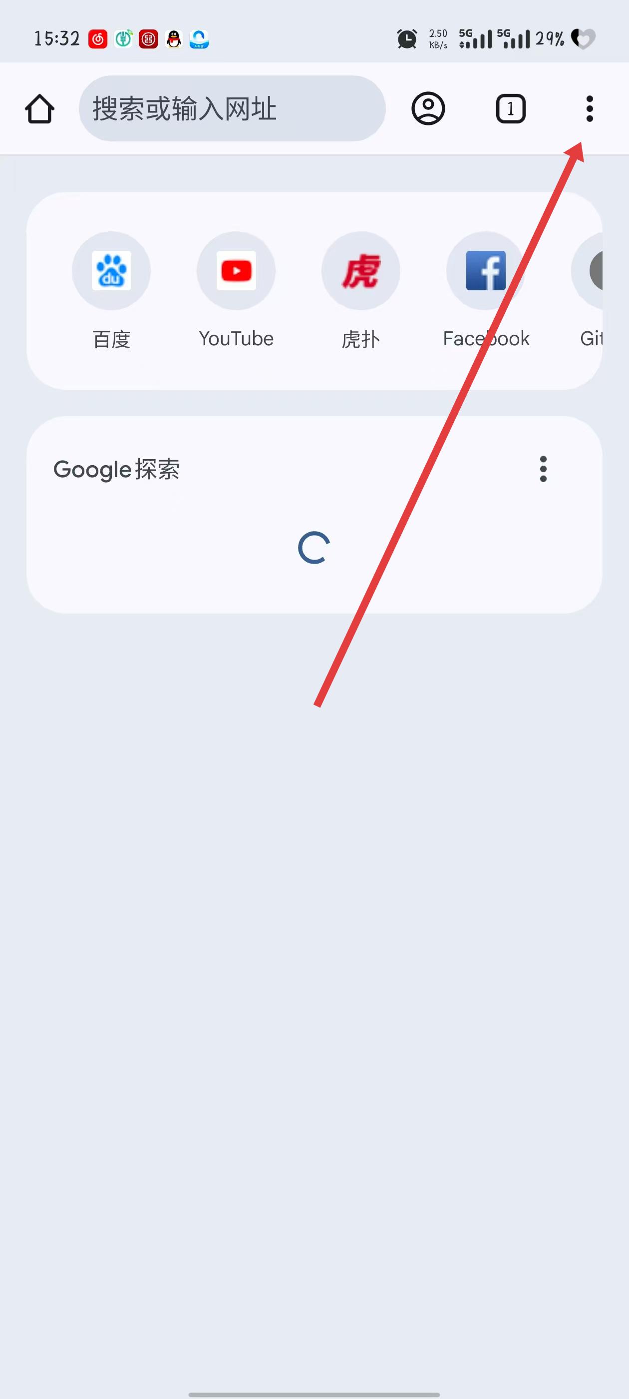 1、打開谷歌瀏覽器,點(diǎn)擊右上角的三點(diǎn)菜單圖標(biāo),進(jìn)入設(shè)置頁面。