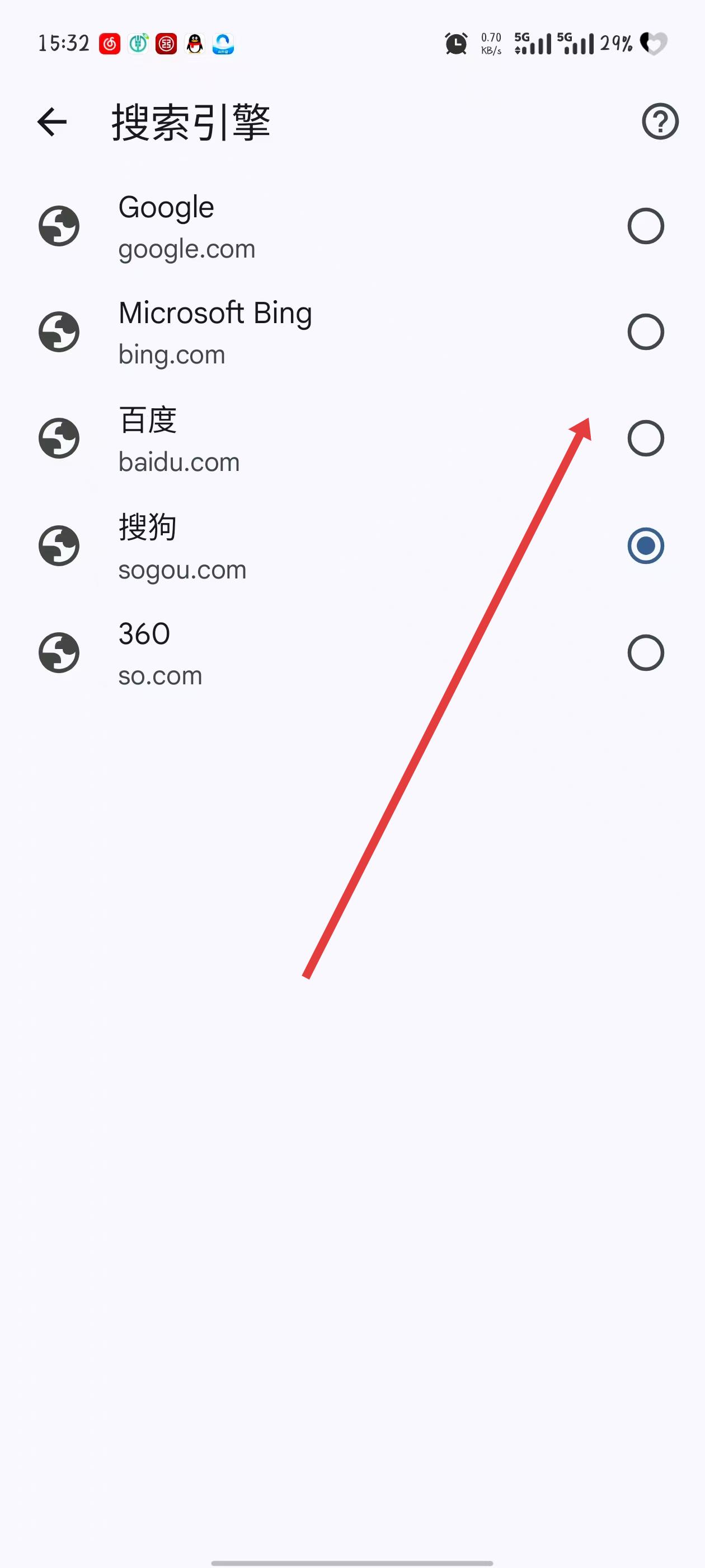 3、在搜索引擎設(shè)置頁面,點(diǎn)擊想要設(shè)置為默認(rèn)搜索引擎對(duì)應(yīng)的圓圈,即可完成更改。