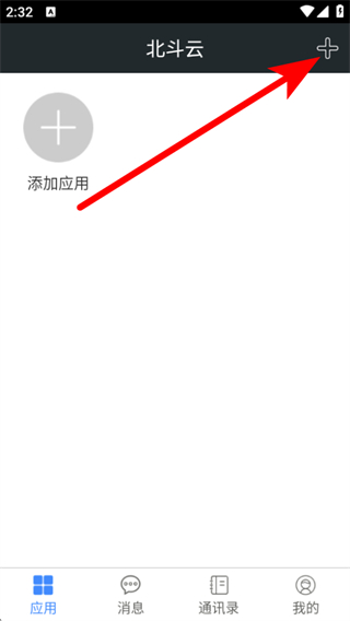 1、打開北斗云APP,在應(yīng)用頁面點擊右上角+號,彈出功能選項列表。