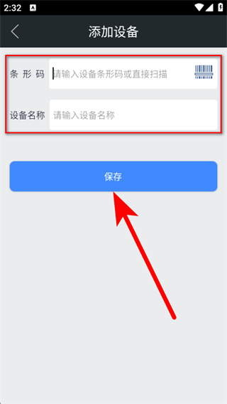 3、在頁面輸入設(shè)備條形碼和設(shè)備名稱,點擊保存,即可完成設(shè)備信息添加操作。
