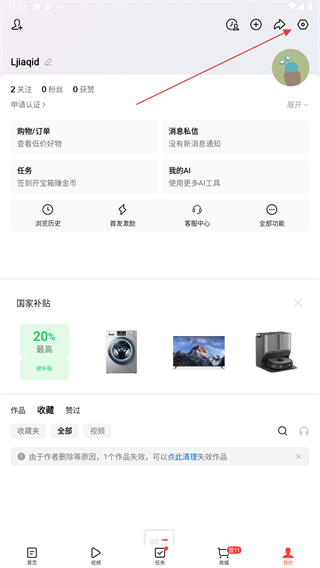 2、進(jìn)入個(gè)人主頁(yè)內(nèi),點(diǎn)擊右上角設(shè)置的功能圖標(biāo)。