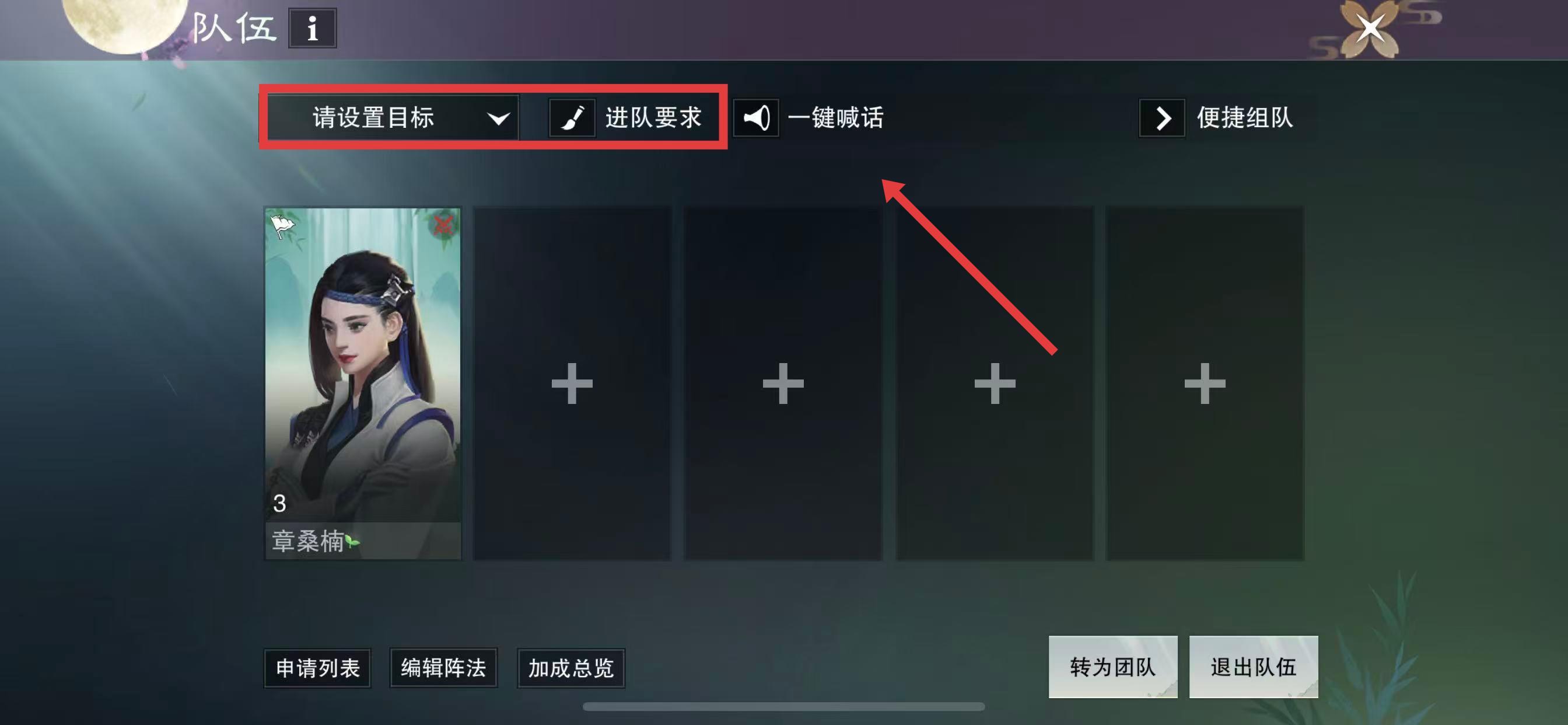 3、創(chuàng)建隊(duì)伍后進(jìn)入隊(duì)伍管理界面,可在此設(shè)置目標(biāo)、進(jìn)隊(duì)要求,也能通過一鍵喊話招募隊(duì)員。