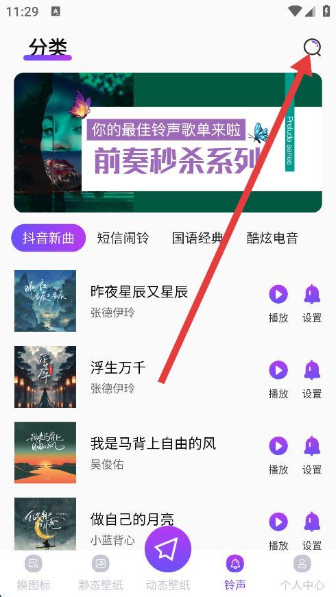 2、進入鈴聲頁面后,點擊右上角的放大鏡搜索圖標,進入搜索頁面。