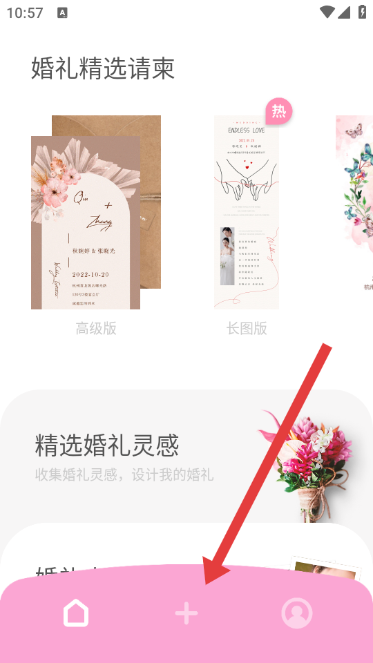 1、在婚禮時光首頁底部,點擊中間的+按鈕,進入請柬創(chuàng)建選項界面。