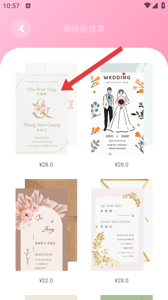 3、在高級版請柬模板列表中,點擊要使用的請柬模板,進入模板預(yù)覽頁面。