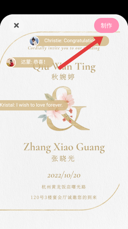 4、在模板預(yù)覽的頁面,點擊右上角粉色的制作按鈕,開始制作請柬。