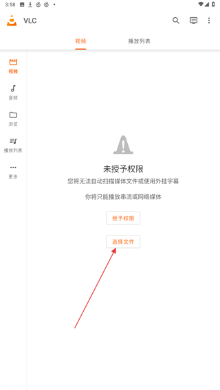 1、打開vlc播放器的應(yīng)用APP,進(jìn)入首頁(yè)點(diǎn)擊選擇文件的按鈕。