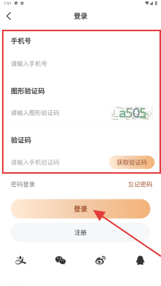 3、進入登錄頁面后,輸入手機號碼,填寫頁面上的圖形驗證碼,獲取驗證碼后再點擊登錄。