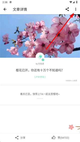 2、在文章詳情頁面點(diǎn)擊右上角的三點(diǎn)菜單圖標(biāo),彈出操作選項(xiàng)。
