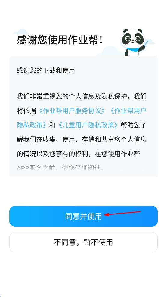 1、打開(kāi)作業(yè)幫App,出現(xiàn)感謝使用提示及協(xié)議說(shuō)明,點(diǎn)擊同意并使用按鈕。