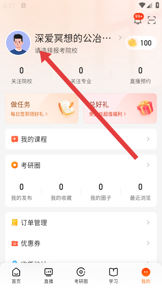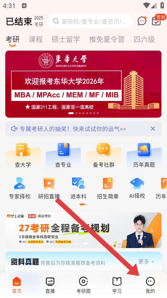 1、在掌上考研的首頁需要點擊我的,進入個人功能的頁面。