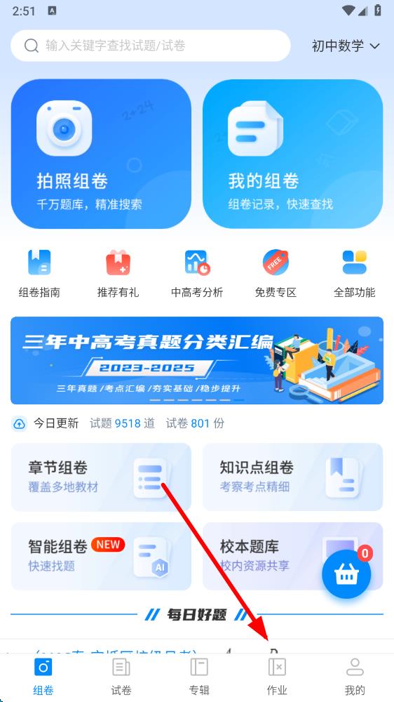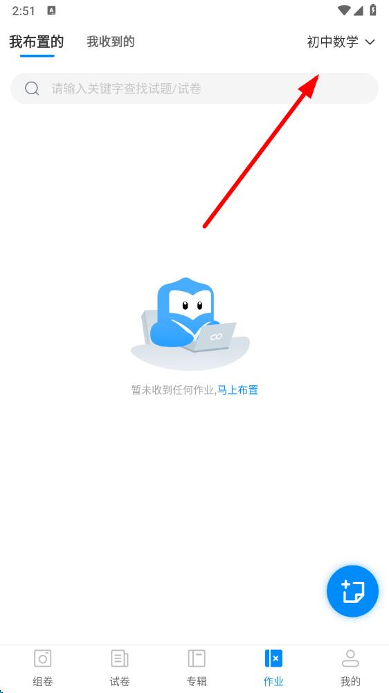 2、在作業(yè)頁面中,點(diǎn)擊學(xué)科名稱如初中數(shù)學(xué)右側(cè)的下拉箭頭。