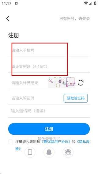 3、在注冊頁面,在輸入框內(nèi)填寫手機(jī)號和密碼。