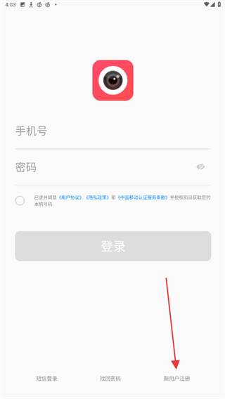 1、打開和目攝像頭APP,若未登錄進(jìn)入時(shí)點(diǎn)擊下方新用戶注冊(cè)的按鈕。