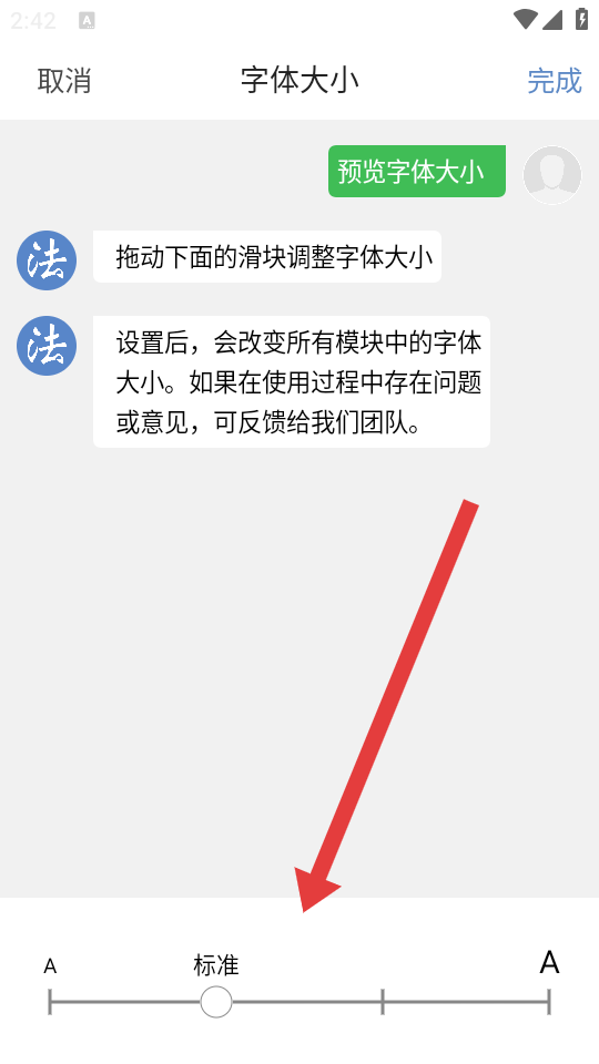 4、拖動(dòng)滑塊調(diào)整字體大小,調(diào)整后點(diǎn)擊完成,即可完成字體的設(shè)置。