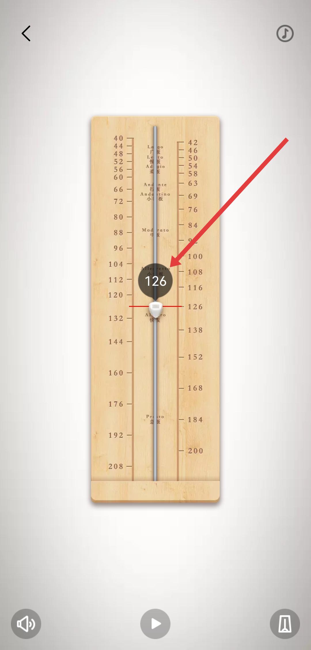2、在節(jié)拍器界面,通過滑動(dòng)或點(diǎn)擊刻度區(qū)域設(shè)置節(jié)拍速度數(shù)值,調(diào)整至適合的節(jié)奏快慢。