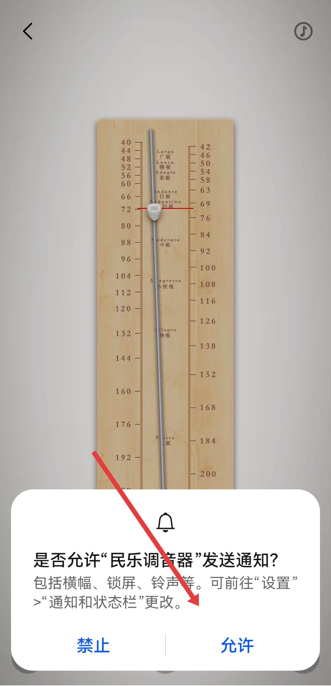 3、若彈出是否允許民樂調(diào)音器發(fā)送通知的權(quán)限請(qǐng)求框,點(diǎn)擊允許關(guān)閉彈窗以繼續(xù)操作。