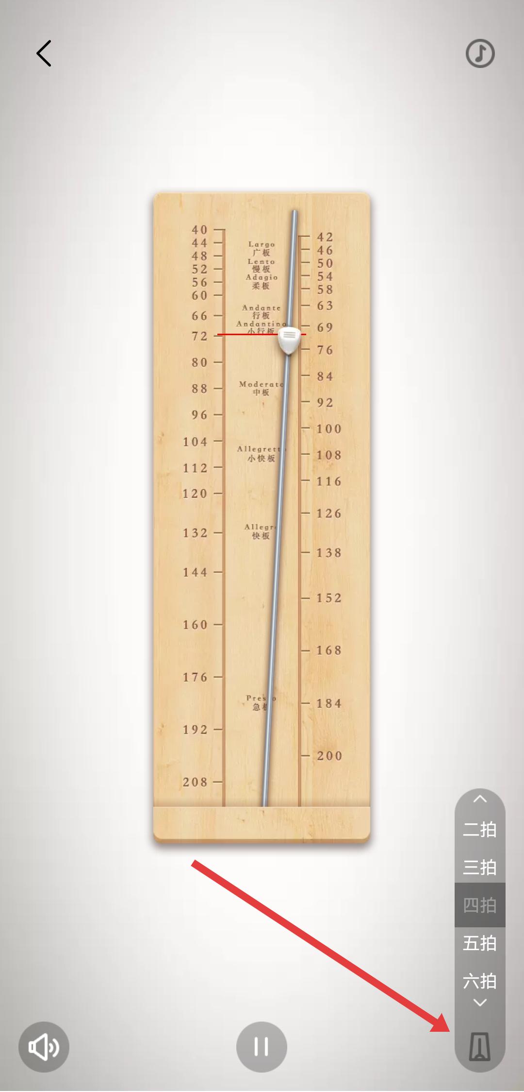4、在節(jié)拍器界面下方,點(diǎn)擊拍數(shù)選擇按鈕,并點(diǎn)擊底部播放/暫停按鈕控制節(jié)拍器運(yùn)行。