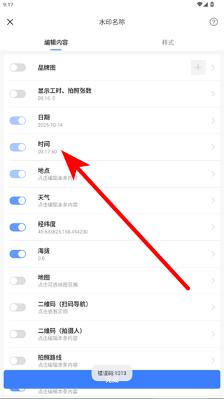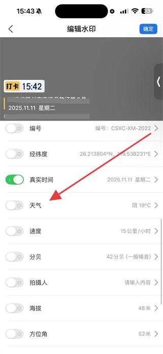 2、在編輯水印頁(yè)面中找到天氣選項(xiàng),點(diǎn)擊開啟后進(jìn)入天氣設(shè)置界面。
