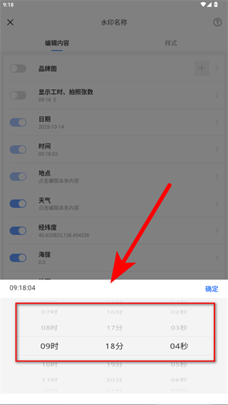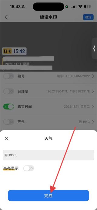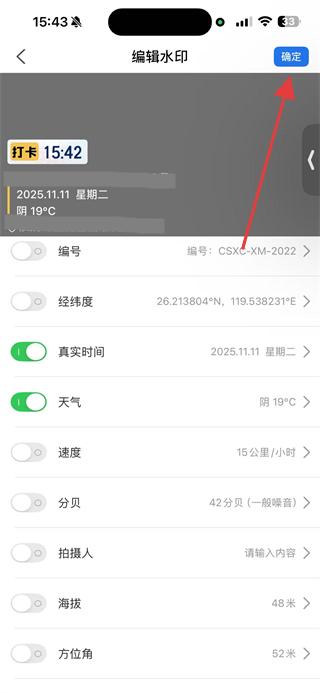 4、設(shè)置完成后點(diǎn)擊右上角確定,即可在水印中顯示天氣信息。