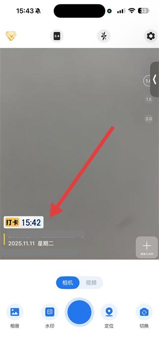 1、打開搞定水印相機(jī)APP,在拍攝界面點(diǎn)擊下方顯示的時(shí)間區(qū)域,進(jìn)入水印編輯頁(yè)面。