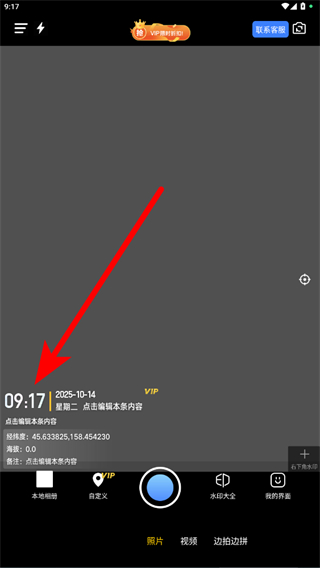 1、打開搞定水印相機(jī)APP,在拍攝界面點(diǎn)擊下方顯示的時(shí)間區(qū)域,進(jìn)入水印編輯頁面。