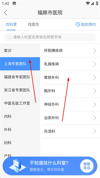3、在科室選擇頁(yè)面,選擇相應(yīng)的專家團(tuán)隊(duì)和科室。