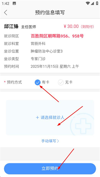 6、選擇預(yù)約方式,選擇或添加就診人后點(diǎn)擊立即預(yù)約。