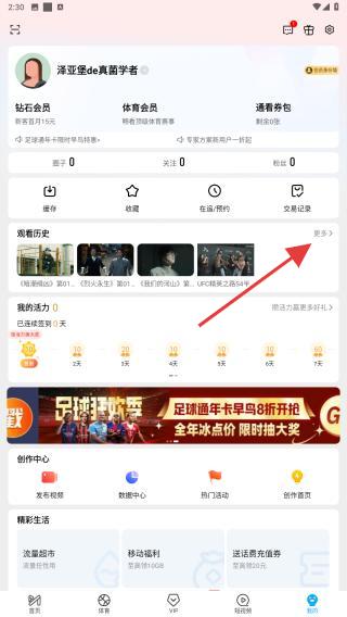 2、在個人中心頁面中,找到觀看歷史的板塊,點擊其右側(cè)的更多的按鈕。