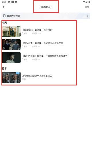 3、進入觀看歷史的頁面后,即可看到所有看過的視頻記錄,包括今天、更早的播放內(nèi)容。