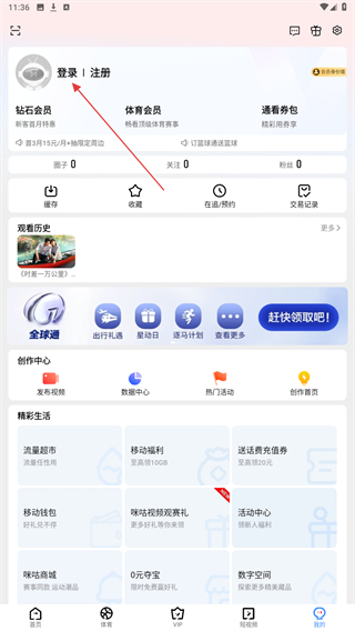 1、啟動咪咕視頻APP并進入到首頁,點擊底部導航欄最右側(cè)的我的。