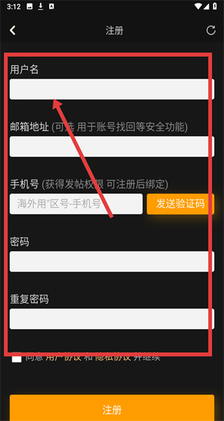 4、在跳轉(zhuǎn)到注冊頁面后,點(diǎn)擊輸入框依次填寫對應(yīng)的注冊信息,填寫好號點(diǎn)擊注冊按鈕,即可完成注冊操作。