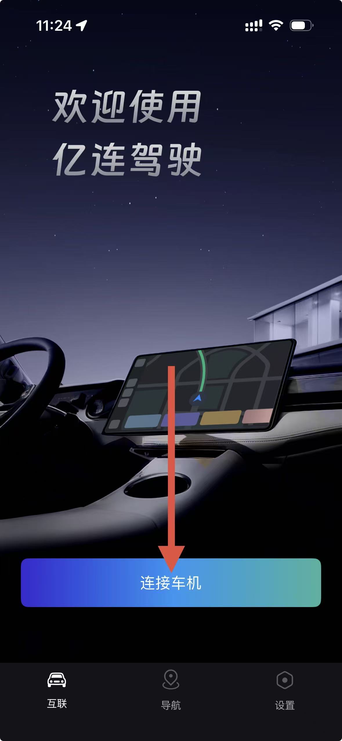 1、打開(kāi)億連駕駛助手APP,在歡迎界面點(diǎn)擊連接車(chē)機(jī)按鈕。