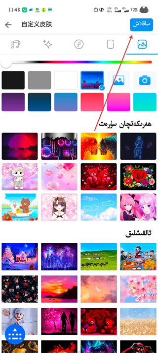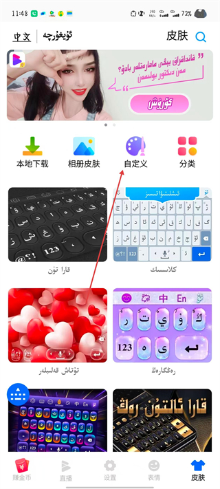 1、打開維語輸入法應(yīng)用,在皮膚頁面點擊自定義選項。