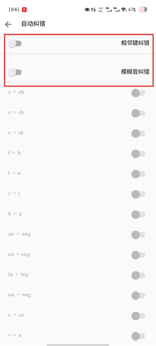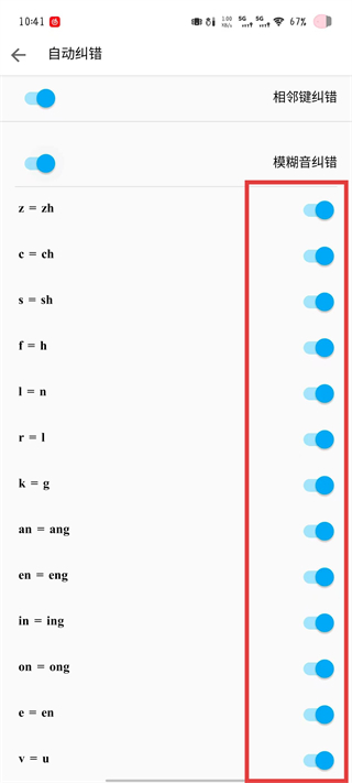 4、接著找到模糊音糾錯及下方相關(guān)拼音糾錯的開關(guān)按鈕,將這些開關(guān)切換為開啟。
